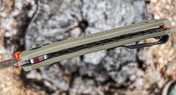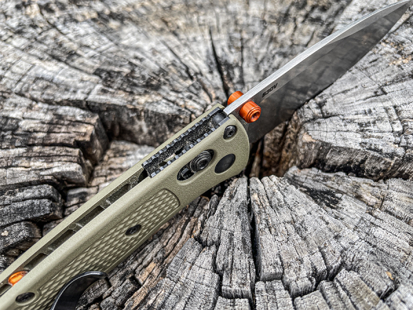 That’s amazingly light and is accomplished thanks to the Grivory (thermoplastic) scales Benchmade uses that have no liners. Instead, they’re molded with an internal grid design that gives them strength and rigidity.