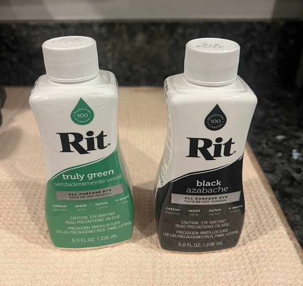 I use Rit brand ‘general purpose’ dye and I buy it locally at my grocery store. They were out of dark green, and I’m impatient, so I went with light green and black.