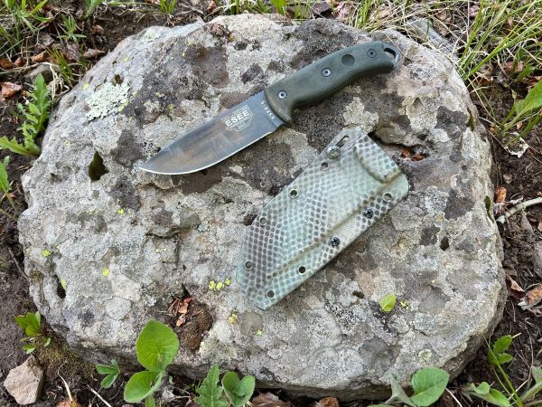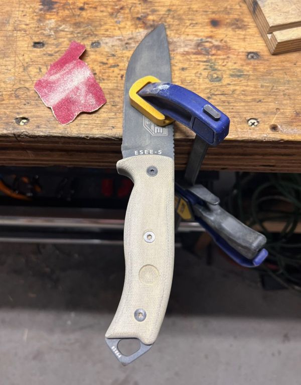 It’s important to know that we can generally only dye material to a darker color. Starting out with a lighter color micarta is best, so if it’s tan or khaki, all the better. I bought an ESEE 5 a while back and wanted the dark gray blade coating instead of the black. This model was only available with tan handle scales and since I was going to paint the sheath to follow Rule #1, it made sense to get the tan handles and dye them myself. This knife is destined to be beaten through all sorts of things, so I felt like a little customization was fitting.