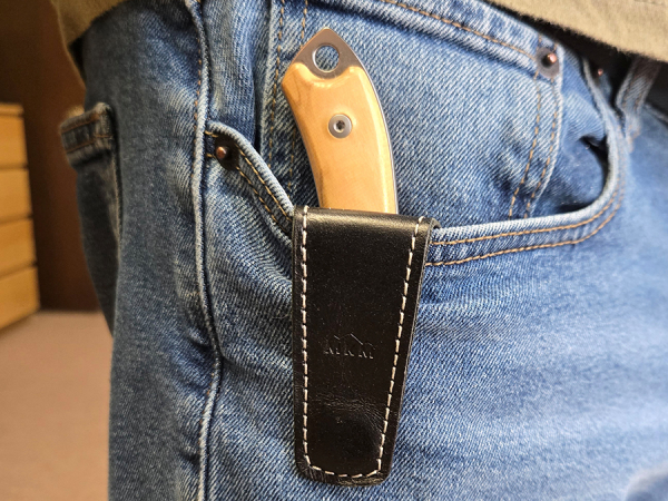 David and MKM knocked it out of the park with this sheath. It’s classy looking, but more importantly performs perfectly. You can slide the knife into it in either direction to, so it can easily be used in the right or left pocket. This is probably the best designed fixed blade pocket sheath I’ve used.