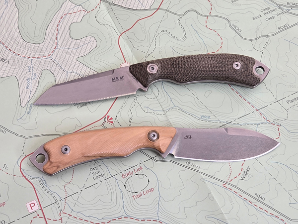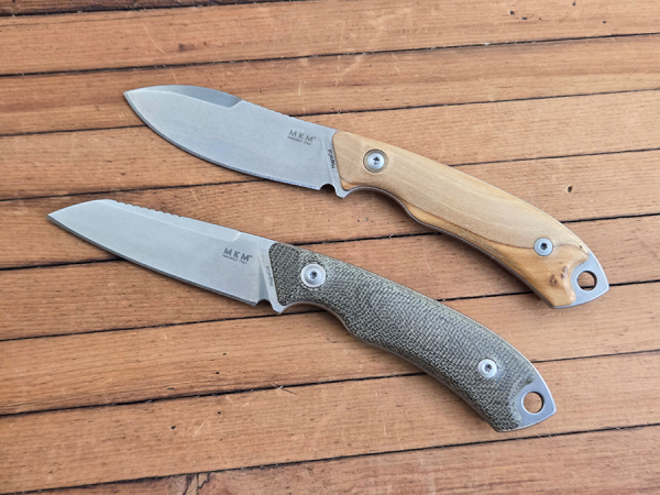 I ended up trying out a Nessmuk pattern blade with an Olive Wood handle and a reverse Tanto blade with a Green Canvas Micarta handle.